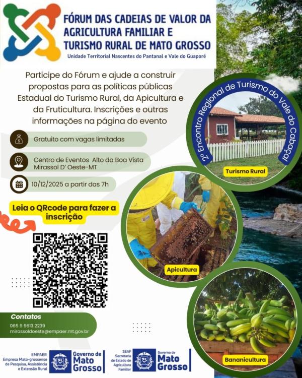O Fórum das Cadeias de Valor da Agricultura Familiar e Turismo Rural de Mato Grosso é uma realização da Empaer-MT, SEAF-MT em parceria com municípios e consórcios regionais. Tem como objetivo o impulsionamento do desenvolvolvimento sustentável da agricultura e do turismo rural em todos os elos das respectivas cadeias de valor. E, de forma ativa, abordará temas relacionados à apicultura, fruticultura e turismo rural, por meio de câmaras temáticas para cada assunto, tendo um moderador que conduzirá a discução para propor soluções à atividade focal.
