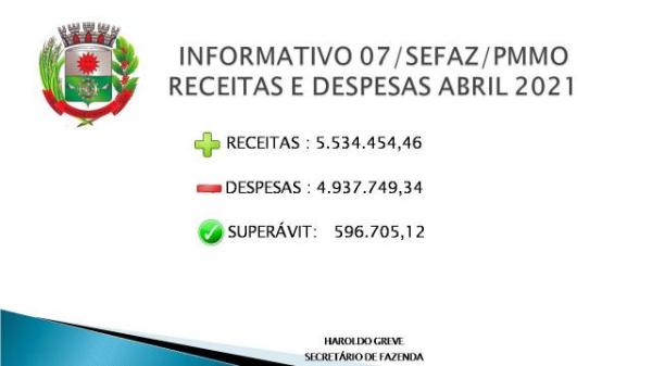 “Damos graças a Deus pelos resultados positivos referentes à arrecadação municipal no mês de abril de 2021, haja visto a dificuldade econômica em que passam os municípios brasileiros. Isso demonstra o compromisso da Administração Municipal com relação à boa aplicação das receitas arrecadadas e o controle dos gastos públicos, gerando sustentabilidade econômica e social no município, ressalta o Secretário de Fazenda Haroldo Greve.”