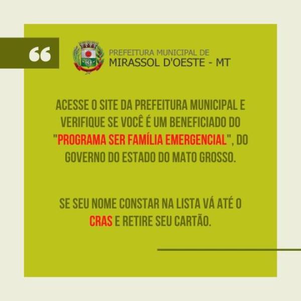 Verifique se você é um dos beneficiados do SER FAMÍLIA EMERGENCIAL, programa do governo do estado do Mato Grosso, caso seu nome se encontre na lista, faça a retirada no CRAS - Centro de Referência de Assistência Social, situado na rua Goiás nº 3801, Cidade Tamandaré em Mirassol D'Oeste - MT.