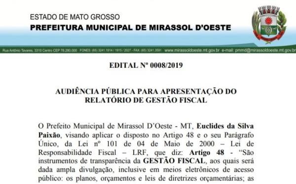 O Prefeito Municipal de Mirassol D’Oeste - MT, Euclides da Silva Paixão, visando aplicar o disposto no Artigo 48 e o seu Parágrafo Único, da Lei nº 101 de 04 de Maio de 2000 – Lei de Responsabilidade Fiscal – LRF, vem convidar a todos os membros da sociedade organizada ou a quem este interessar, que no dia 28 de fevereiro de 2019, às 9:00 (nove horas), nas dependências da Câmara Municipal de Vereadores localizada à R. Juscelino Kubitscheck, 3226, estará sendo realizada a AUDIÊNCIA PÚBLICA, envolvendo os diversos segmentos da sociedade, para discussão e apreciação do RELATÓRIO DE GESTÃO FISCAL, do 3º quadrimestre de 2018.