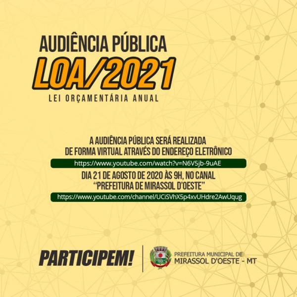 O Prefeito do Município de Mirassol D´Oeste Estado de Mato Grosso, vêm a público comunicar a todos os cidadãos miradolenses que em atendimento a Lei Federal 13.979 de 06/02/2020; Decreto Estadual 407 de 16/03/2020; Portaria do Ministério da Saúde 356 de 11/03/2020; Decreto Federal 10.212 de 30/01/2020; Decretos Estaduais 425 de 25/03/2020 e 432 de 31/03/2020 e os Decretos Municipais 3690 de 17/03/2020; 3693 de 20/03/2020; 3694 de 22/03/2020 e 3695 de 26/03/2020, haverá Audiência Pública para apresentação e discussão da proposta da Lei Orçamentária-LOA/2021.