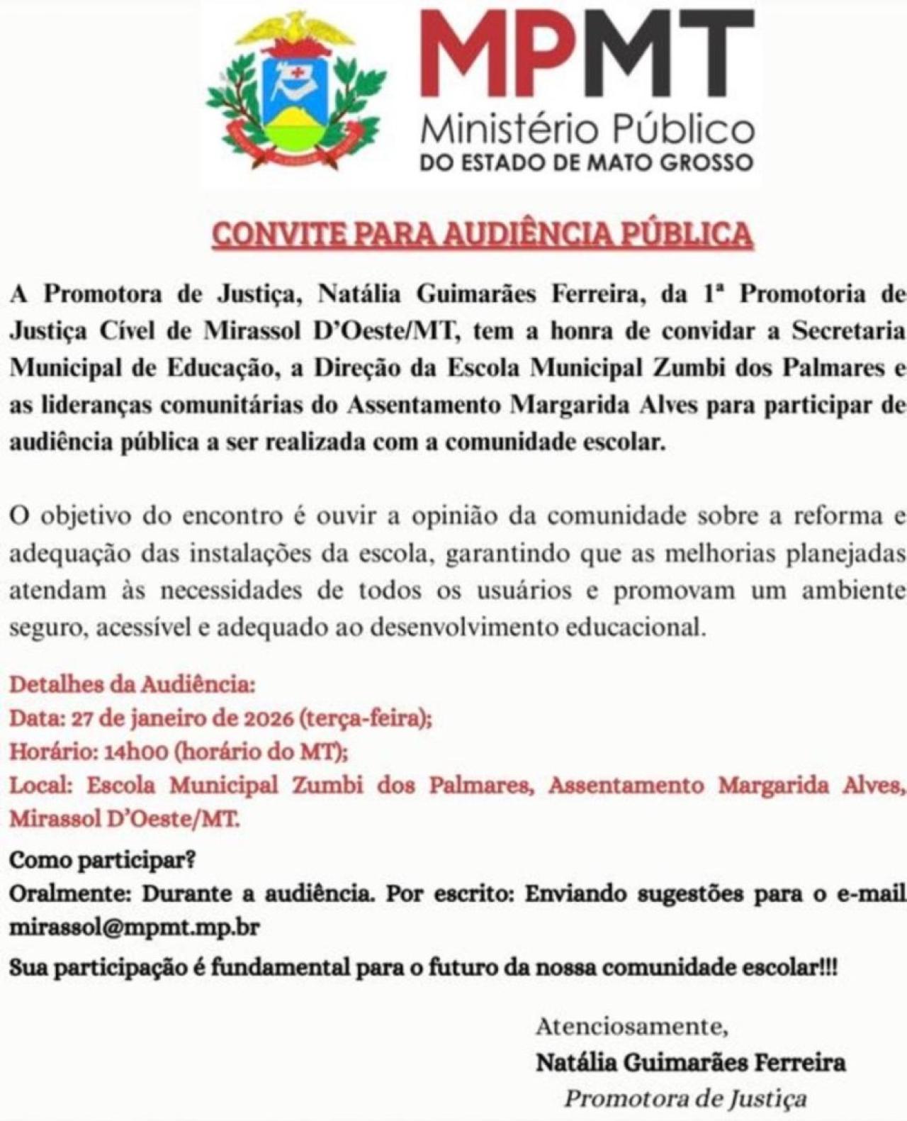 A Prefeitura de Mirassol d’Oeste informa que foi realizada, no dia 27 de janeiro de 2026, às 14h, uma audiência pública para discutir a reforma e adequação da Escola Municipal Zumbi dos Palmares, no Assentamento Margarida Alves.