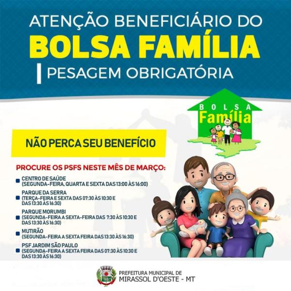 A coordenação do Programa Bolsa Família em Mirassol D Oeste comunica todas as mães beneficiadas a comparecerem nos PSFs: