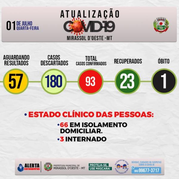 Estado clínico das pessoas: 66 em isolamento domiciliar, 3 Internados, 1 óbito, 23 estão Recuperados.