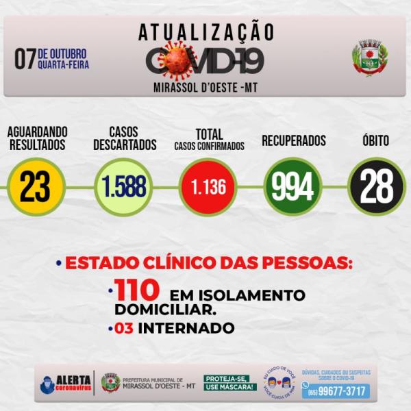 O monitoramento mostra ainda que a cidade tem 23 casos suspeito e 1.588 descartados.