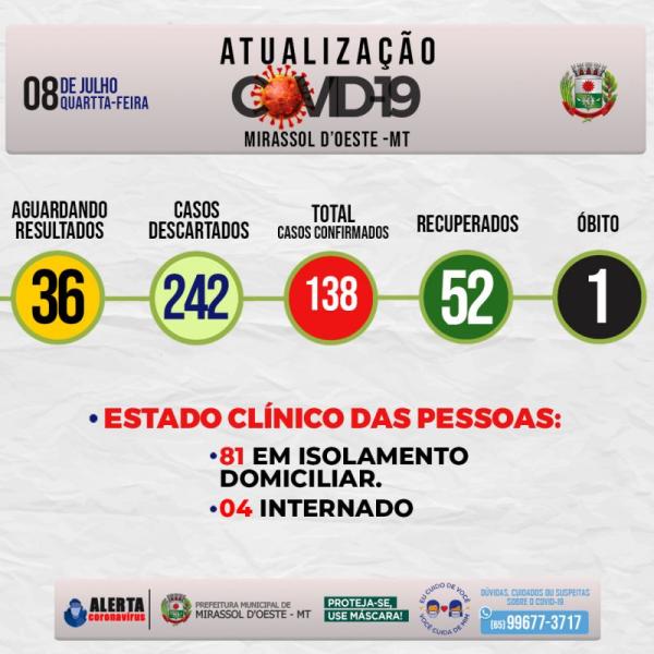 Estado clínico das pessoas: 81 em isolamento domiciliar, 4 Internados, 1 óbito, 52 estão Recuperados.