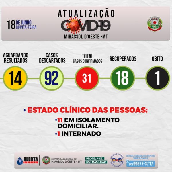 Estado clínico das pessoas: 11 em isolamento domiciliar, 1 Internados, 1 óbito, 18 estão Recuperados.