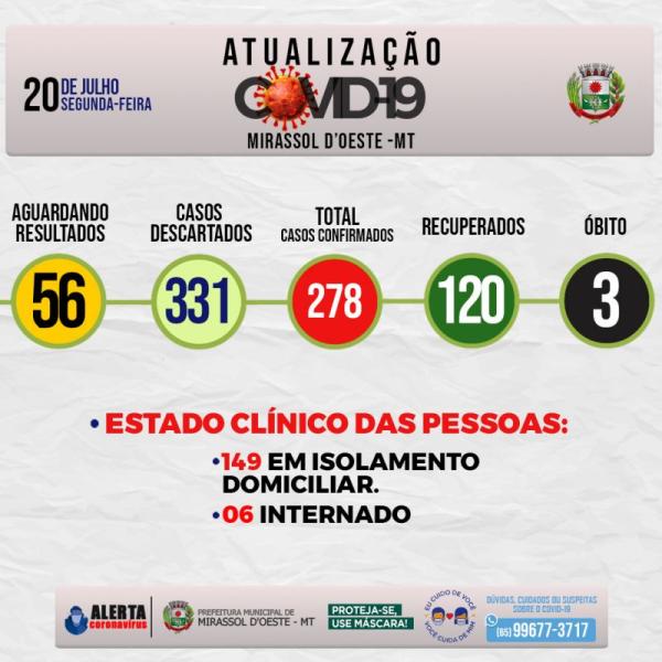 Estado clínico das pessoas: 149 em isolamento domiciliar, 6 Internados, 3 óbito, 120 estão Recuperados.