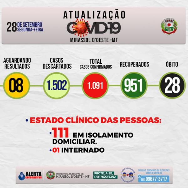 Estado clínico das pessoas: 111 em isolamento domiciliar, 01 Internados, 28 óbito, 951 estão Recuperados.