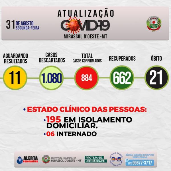 Estado clínico das pessoas: 195 em isolamento domiciliar, 06 Internados, 21 óbito, 662 estão Recuperados.