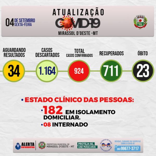 Estado clínico das pessoas: 182 em isolamento domiciliar, 08 Internados, 23 óbito, 711 estão Recuperados.