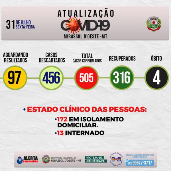 Estado clínico das pessoas: 172 em isolamento domiciliar, 13 Internados, 4 óbito, 316 estão Recuperados.
