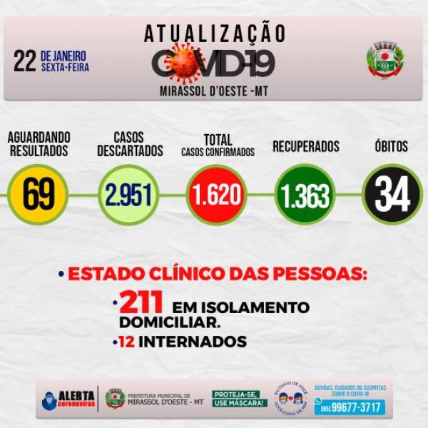 Estado clínico das pessoas: 211 em isolamento domiciliar, 12 Internados, 34 óbitos, 1.363 estão Recuperados.