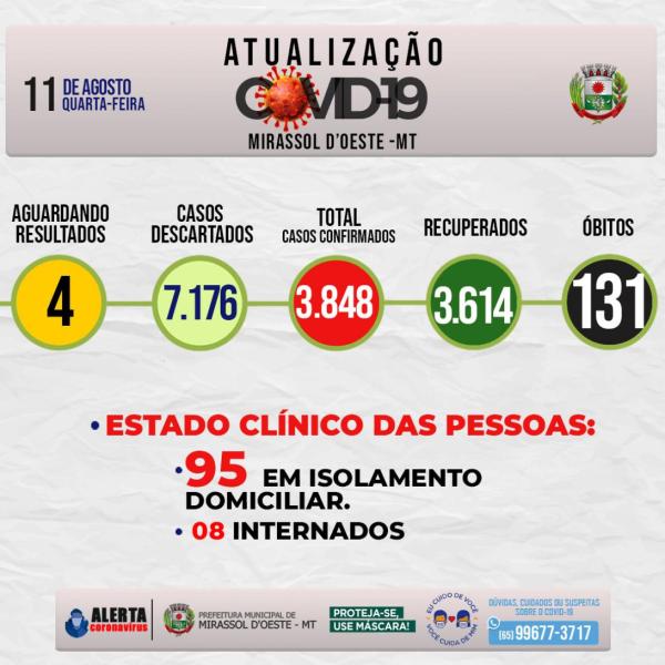 Estado clínico das pessoas: 95 em isolamento domiciliar, 08 Internados, 131 óbitos, 3.614 estão Recuperados.