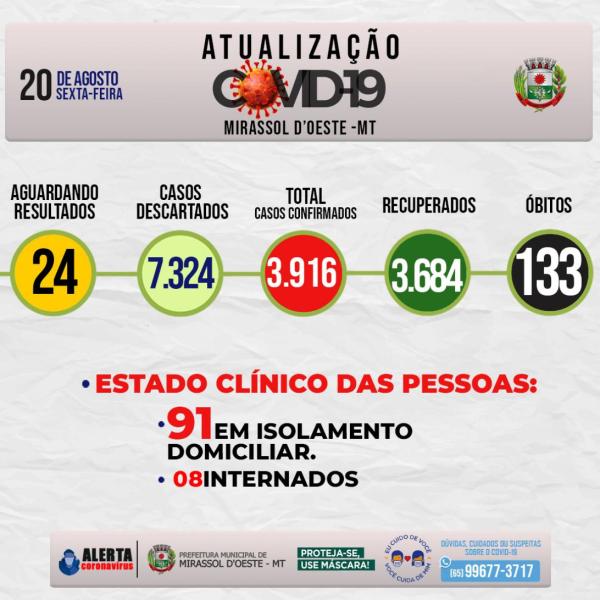 Estado clínico das pessoas: 91 em isolamento domiciliar, 08 Internados, 133 óbitos, 3.684 estão Recuperados.