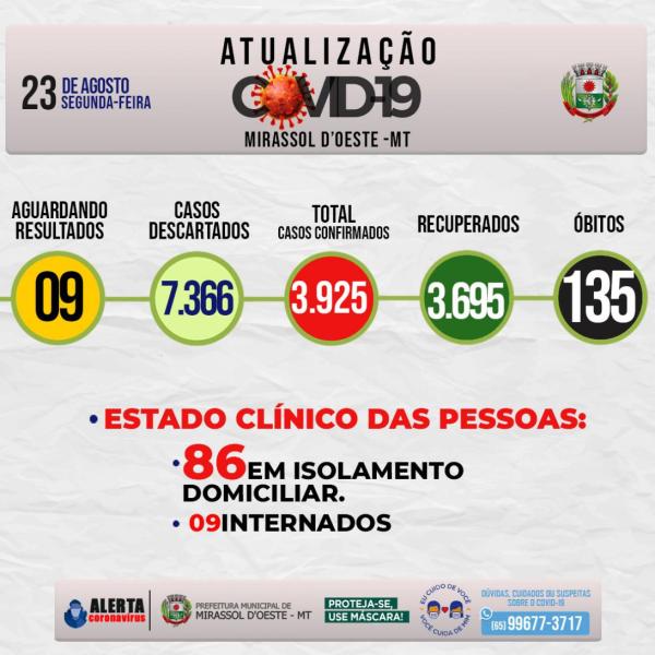 Estado clínico das pessoas: 86 em isolamento domiciliar, 09 Internados, 135 óbitos, 3.695 estão Recuperados.