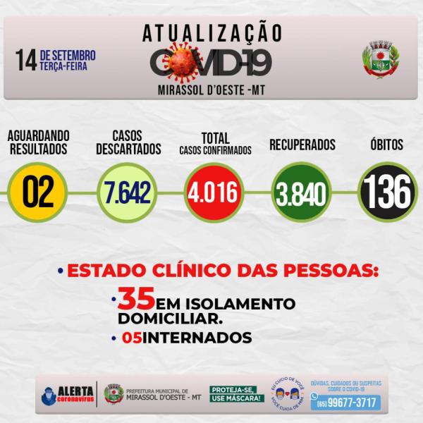 Estado clínico das pessoas: 35 em isolamento domiciliar, 05 Internados, 136 óbitos, 3.840 estão Recuperados.