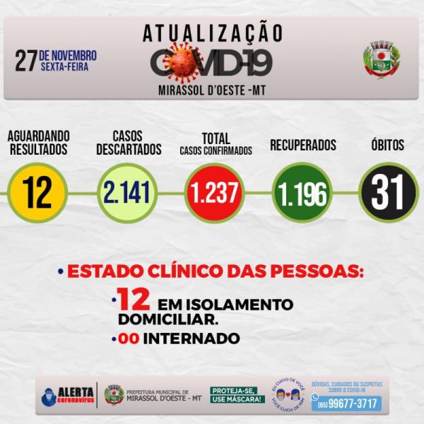 Estado clínico das pessoas: 12 em isolamento domiciliar, 00 Internado, 31 óbitos, 1.196 estão Recuperados.