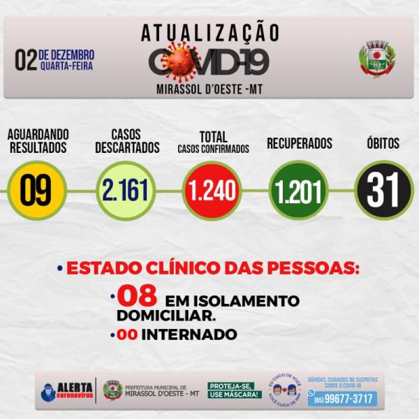 O monitoramento mostra ainda que a cidade tem 09 casos suspeito e 2.161 descartados.