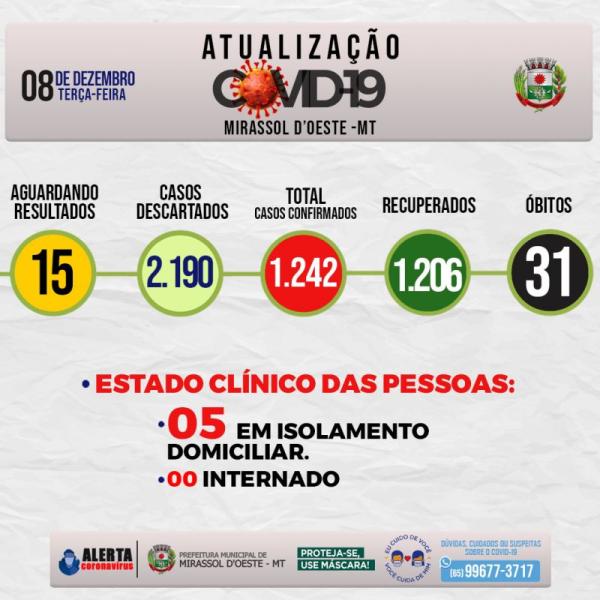 Estado clínico das pessoas: 05 em isolamento domiciliar, 00 Internado, 31 óbitos, 1.206 estão Recuperados.