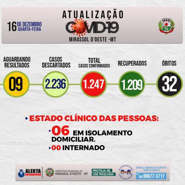 Estado clínico das pessoas: 06 em isolamento domiciliar, 00 Internado, 32 óbitos, 1.209 estão Recuperados.
