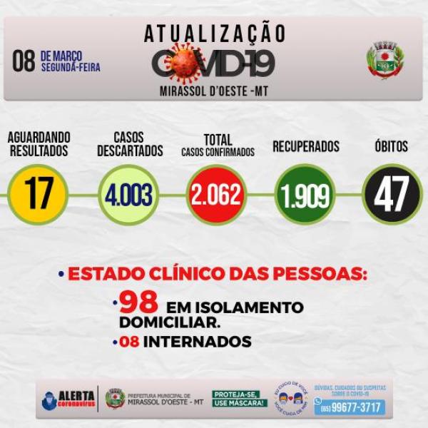 Estado clínico das pessoas: 98 em isolamento domiciliar, 08 Internados, 47 óbitos, 1.909 estão Recuperados.