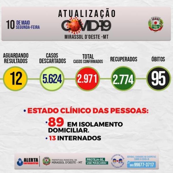 Estado clínico das pessoas: 89 em isolamento domiciliar, 13 Internados, 95 óbitos, 2.774 estão Recuperados.