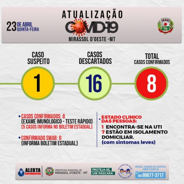 O boletim divulgado nesta quinta (23/4) pela Secretaria Municipal da Saúde confirma mais 1 novo caso de covid-19 em moradores da cidade. Com essa atualização, o número total de casos chega a 8.