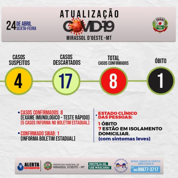 O boletim divulgado nesta Sexta (24/4) pela Secretaria Municipal da Saúde confirmou a primeira morte em Mirassol com resultado positivo de covid-19. A vítima é uma Jovem de 23 anos, Moradora da cidade de Mirassol d’Oeste.
