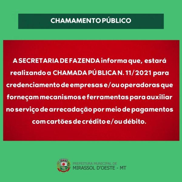 INEXIGIBILIDADE n. 11/2021 (CHAMAMENTO PÚBLICO) – A SECRETARIA DE FAZENDA informa que, estará realizando a CHAMADA PÚBLICA N. 11/2021 para credenciamento de empresas e/ou operadoras que forneçam mecanismos e ferramentas para auxiliar no serviço de arrecadação por meio de pagamentos com cartões de crédito e/ou débito. Período de Credenciamento de 16/08/2021 a 09/09/2021 das 7:00 as 13h na Sala de Licitações na Prefeitura Municipal de Mirassol D'oeste/Mt. A sessão pública de análise dos projetos ocorrerá no dia 09/09/2021, HORÁRIO: 8h. INFORMAÇÕES NOS TELEFONES (65) 3241-1012/3090 OU NA PREFEITURA: localizada na rua Antonio Tavares n.3310, Centro.