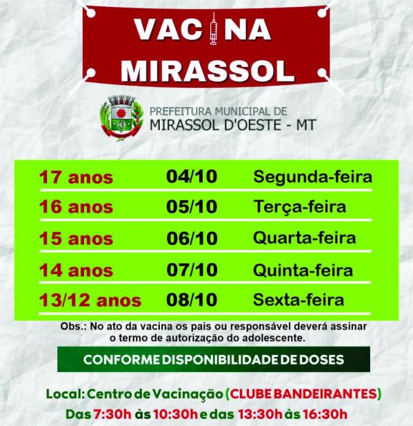 Obs.: No ato da vacina os pais ou responsáveis deverão assinar o termo de autorização do adolescente.
