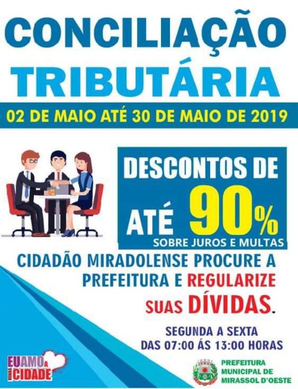 Aproveite o programa de Conciliação Tributária do Município de Mirassol D'Oeste, do dia 2 a 30 de maio de 2019 regularize sua situação com o poder público aproveitando descontos de até 90% sobre juros e multas.