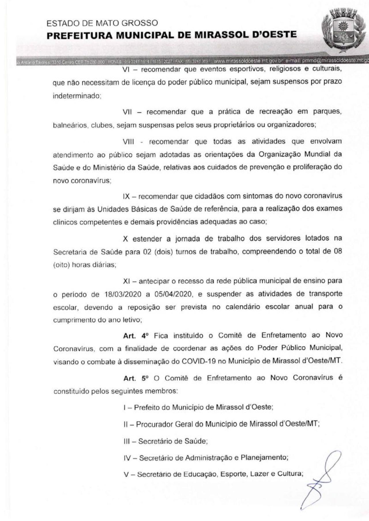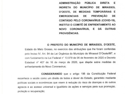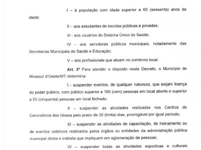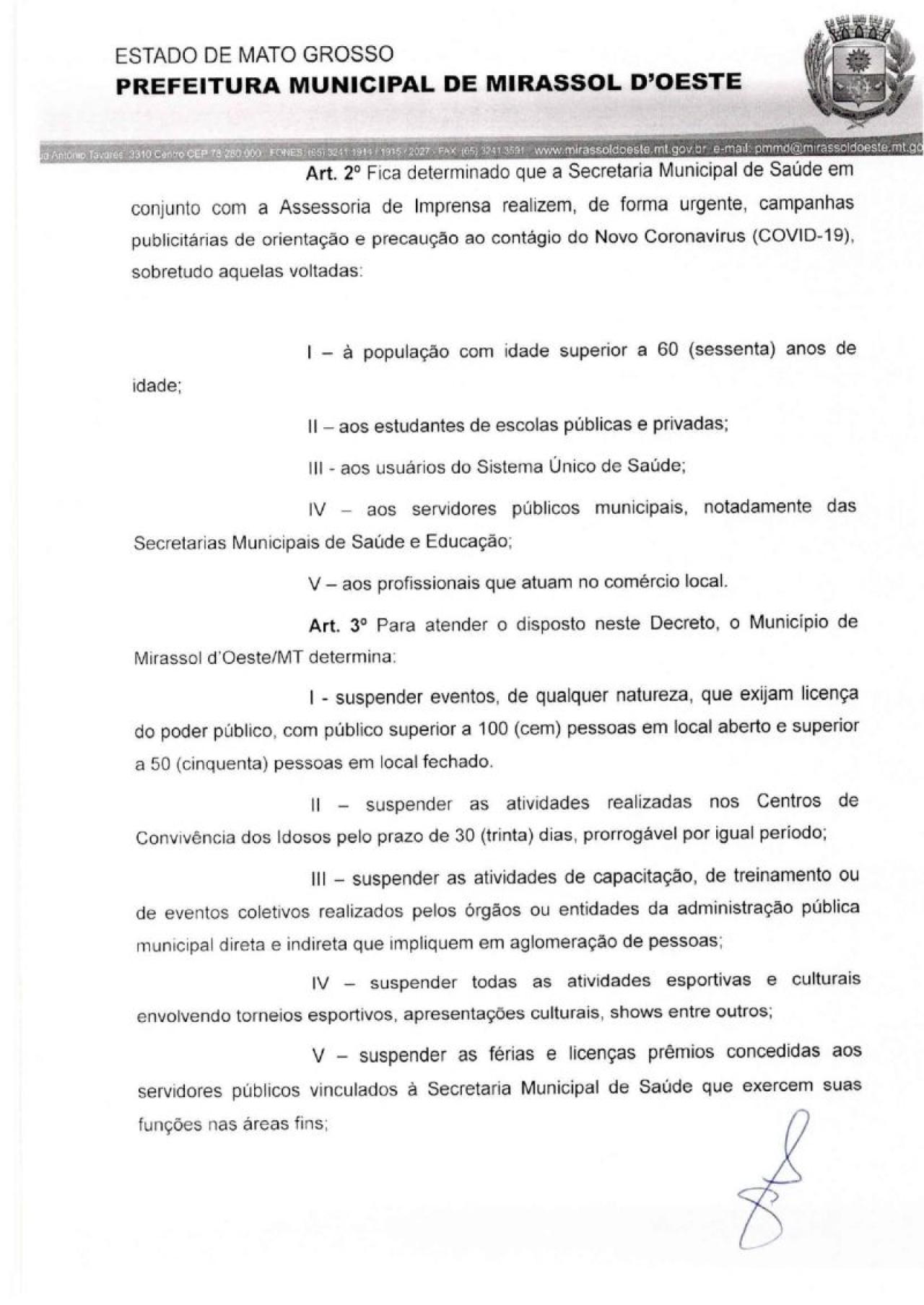 Conforme o Decreto Estadual nº 407, de forma excepcional e com o único objetivo de resguardar o interesse da coletividade na prevenção do contágio e no combate da propagação do coronavírus (COVID-19), A Prefeitura Municipal de Mirassol d’Oeste determina a suspensão, enquanto permanecer o estado de emergência internacional pela doença, das seguintes atividades: