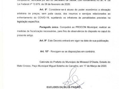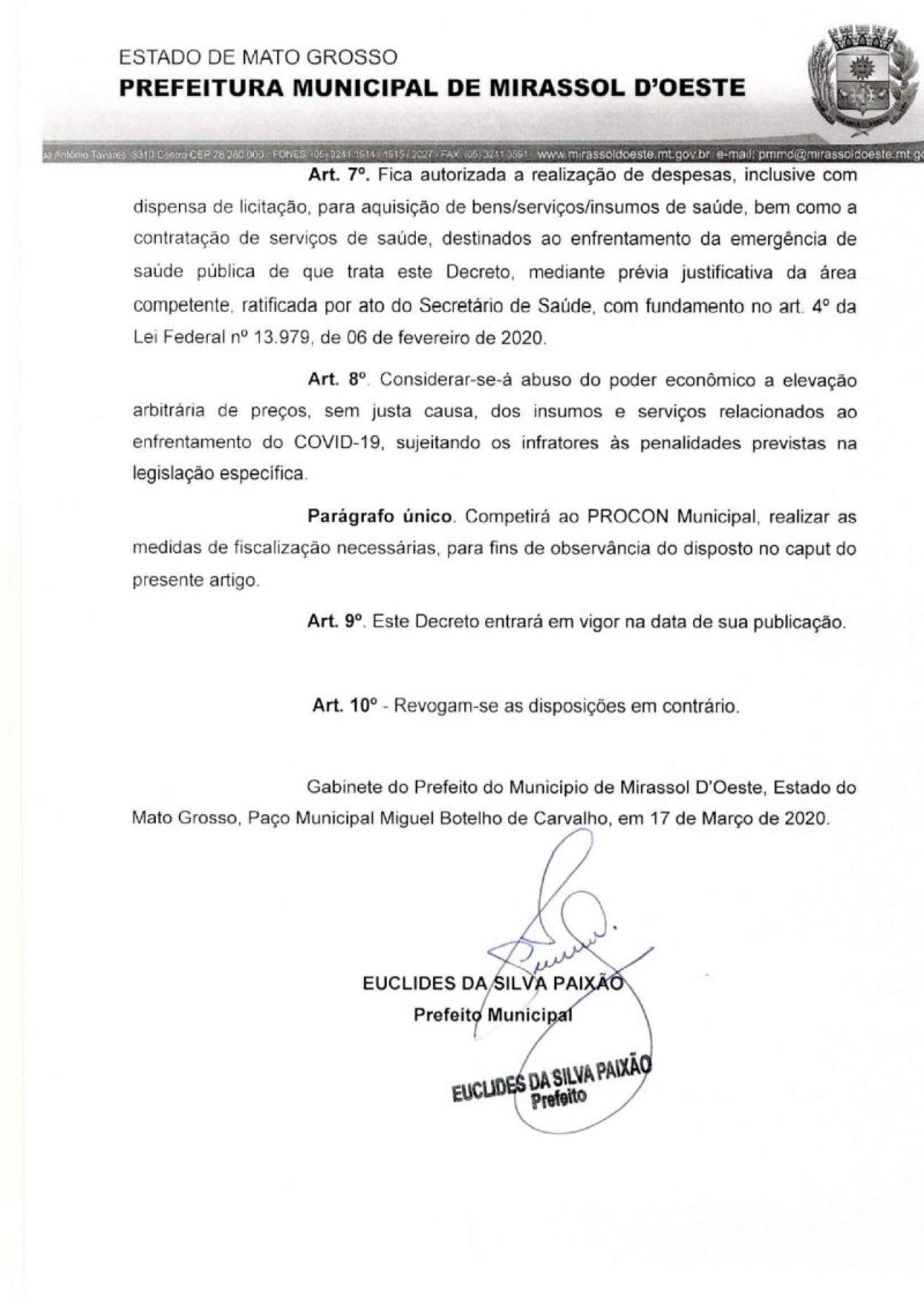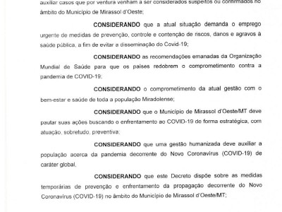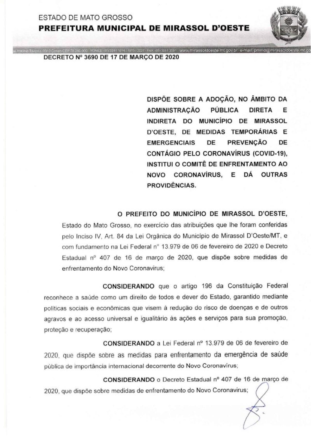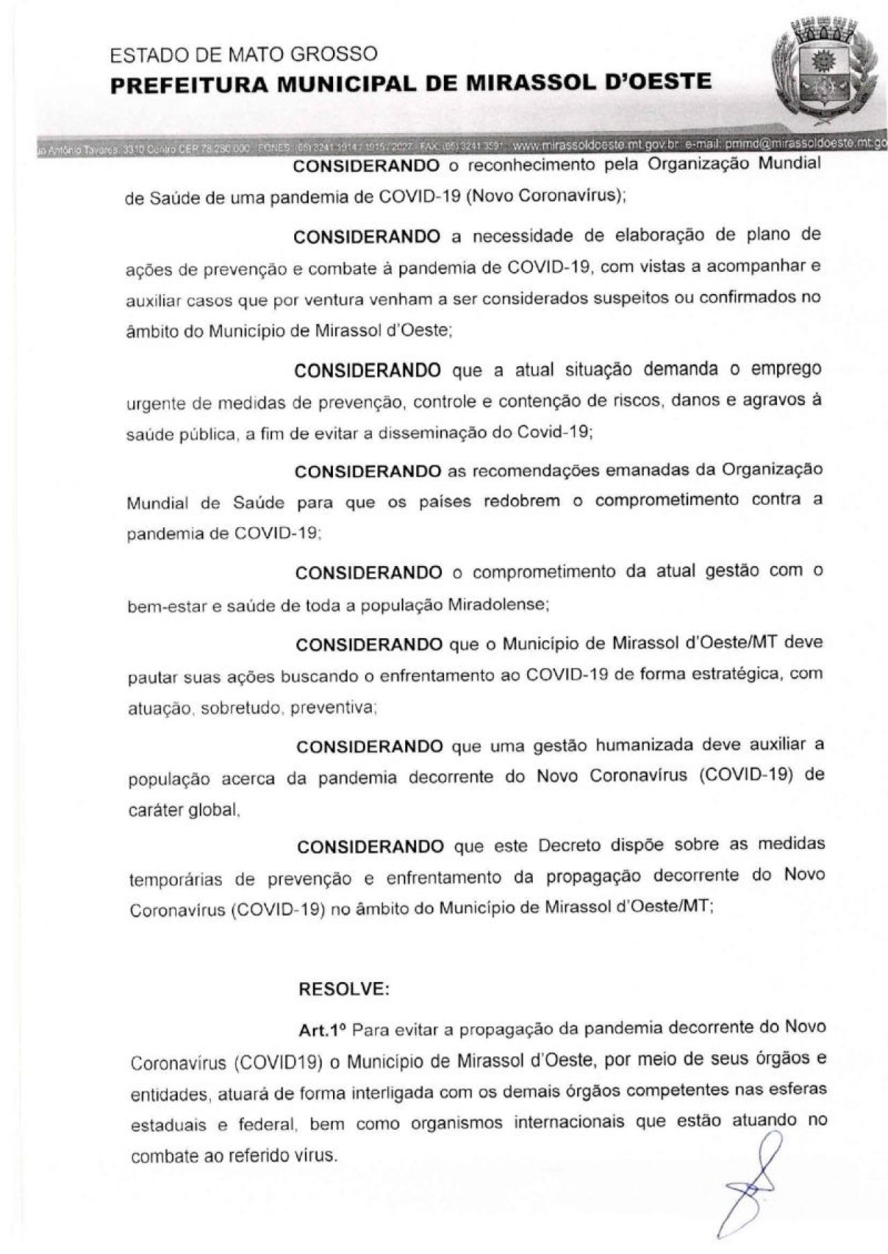 Conforme o Decreto Estadual nº 407, de forma excepcional e com o único objetivo de resguardar o interesse da coletividade na prevenção do contágio e no combate da propagação do coronavírus (COVID-19), A Prefeitura Municipal de Mirassol d’Oeste determina a suspensão, enquanto permanecer o estado de emergência internacional pela doença, das seguintes atividades:
