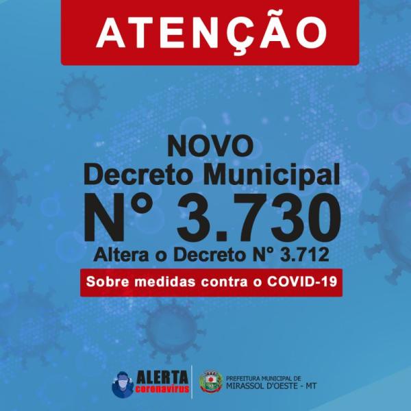 CONSIDERANDO que os Decretos municipais de nº 3690, 3693, 3694, 3695, 3703, 3708 e 3.712 sobre a adoção, no âmbito da Administração Pública direta e indireta do Município de Mirassol d´Oeste, de medidas temporárias e emergenciais, e tendo em vista decisão do Comitê de enfrentamento ao novo Coronavírus, realizado nesta data;