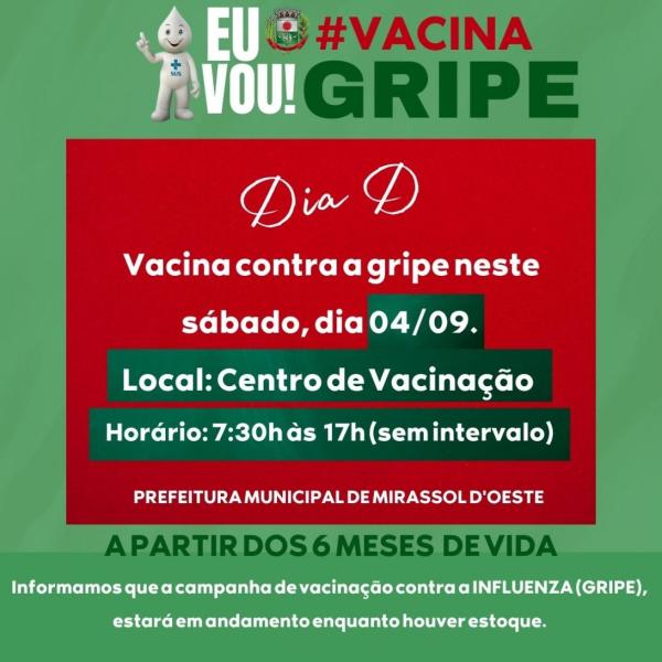 O DIA D da vacina contra a gripe neste sábado, dia 04/09. Os atendimentos serão por livre demanda dentro do horário estabelecido, aos munícipes levar os seguintes documento: RG, CPF, CARTÃO SUS E CARTÃO DE VACINA.