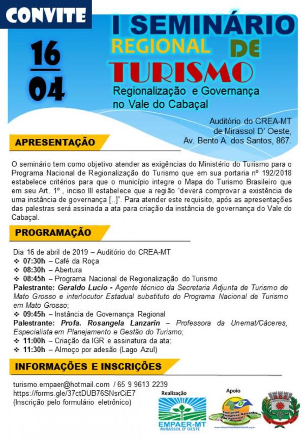 Acontecerá no dia 16/04/2019 o I Seminário Regional de Turismo - Regionalização e Governança no Vale do Cabaçal, no auditório do CREA-MT de Mirassol D' Oeste, Av. Bento A. dos Santos, 867.