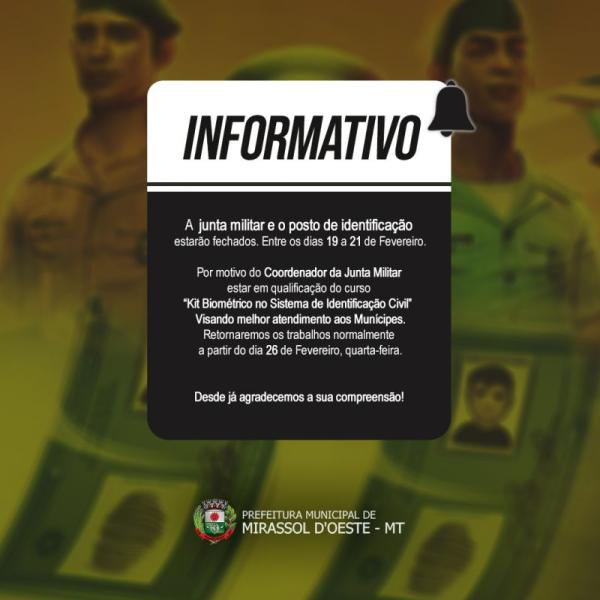 A junta militar e o posto de identificação estarão fechados. Entre os dias 19 a 21 de Fevereiro. Por motivo do Coordenador da Junta Militar estar em qualificação do curso “Kit Biométrico no Sistema de Identificação Civil” Visando melhor atendimento aos Munícipes.