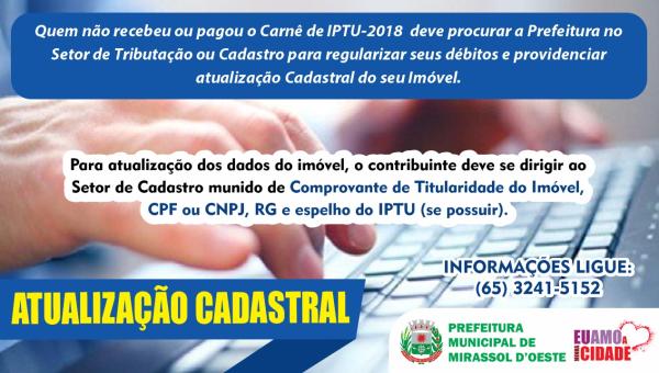 Quem não recebeu ou pagou o Carnê de IPTU-2018, deve procurar a Prefeitura no Setor de Tributação ou Cadastro, para regularizar seus débitos e providenciar atualização Cadastral do seu Imóvel.