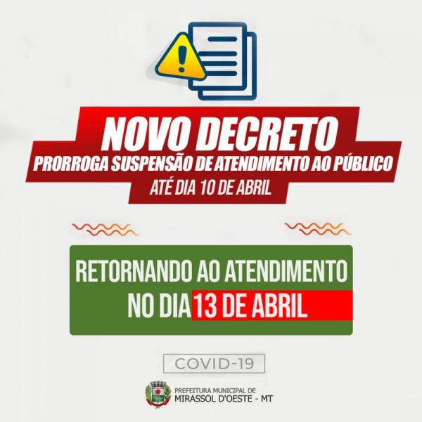 Art. 3º. Fica prorrogado ate 10 de abril de 2020 a suspensão de atendimento ao público de que trata o Inciso III do Art. 5º do Decreto nº 3694/2020, restabelecendo-se o atendimento normal a partir de 13 de abril do corrente mês e ano.
