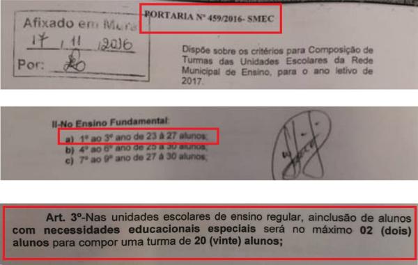 A mesma esclareceu aos responsáveis pelo menor (mãe e avó), que não havia vagas, conforme Portaria n. 459/2016 da SMEC, pois todas as salas já estavam acima do limite, por decisão judicial; que das 3 salas do 2º ano, uma comporta 27 alunos, mas esta com 30 alunos; outra que deveria estar com 20, esta com 23 alunos (um é especial); e a última possui 27 alunos, está no seu limite, ou seja completa.