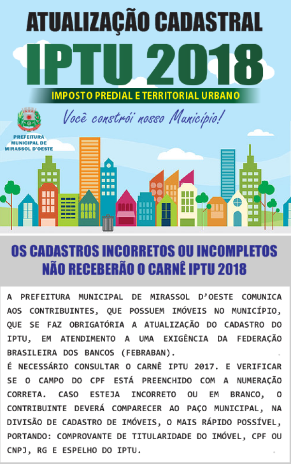 A Prefeitura de Mirassol D’Oeste comunica aos contribuintes, que possuem imóveis no município, que se faz OBRIGATÓRIA A ATUALIZAÇÃO do cadastro do IPTU, em atendimento a uma exigência da Federação Brasileira dos Bancos (FEBRABAN).