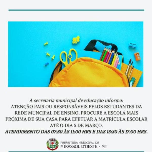 Atenção senhores pais ou responsáveis pelos estudantes da rede municipal de ensino de Mirassol D'Oeste, procure a escola mais próxima de sua casa para efetuar a matrícula escolar até o dia 5 de março.
