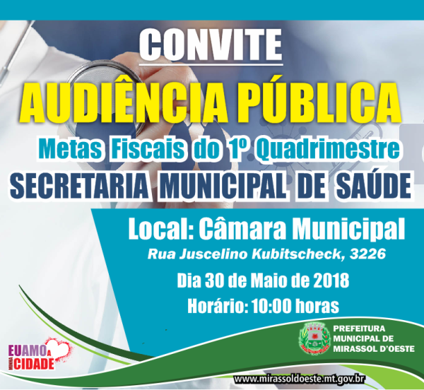 A Prefeitura de Mirassol D’Oeste, por meio da Secretaria Municipal de Saúde, irá apresentar, neste dia 30 de maio, às 10h00m, durante audiência pública realizada na Câmara Municipal, relatório de gestão fiscal.