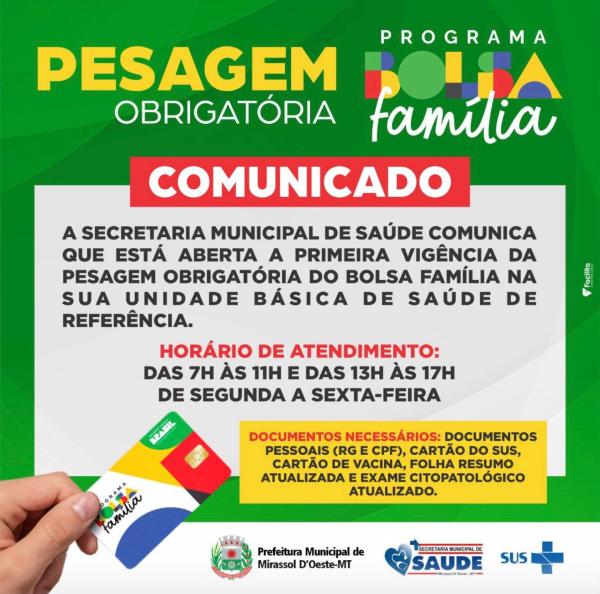 A Secretaria Municipal de Saúde informa que está aberta a vigência da Pesagem Obrigatória do Programa Bolsa Família.
