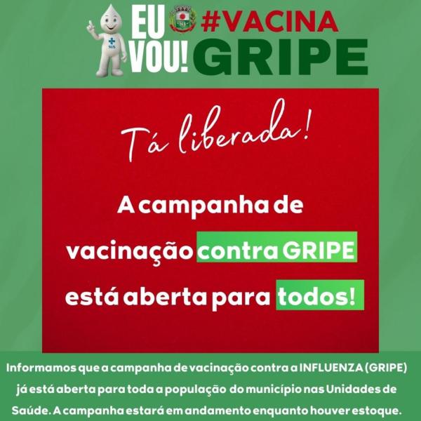 Informamos que a campanha de vacinInformamos que a campanha de vacinação contra a INFLUENZA (GRIPE) já está aberta para toda a população do município nas Unidades de Saúde. A campanha estará em andamento enquanto houver estoque.ação contra a INFLUENZA (GRIPE) já está aberta para toda a população do município nas Unidades de Saúde. A campanha estará em andamento enquanto houver estoque.