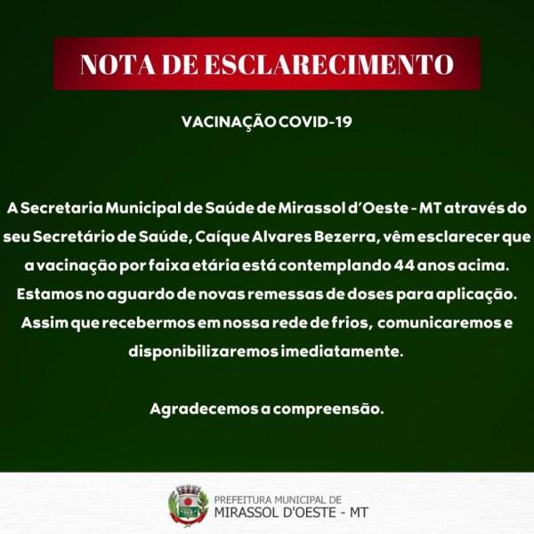 A Secretaria Municipal de Saúde de Mirassol d’Oeste - MT através do seu Secretário de Saúde, Caíque Alvares Bezerra, vêm esclarecer que a vacinação por faixa etária está contemplando 44 anos acima. Estamos no aguardo de novas remessas de doses para aplicação. Assim que recebermos em nossa rede de frios, comunicaremos e disponibilizaremos imediatamente.