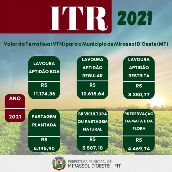 Ficam definidos os seguintes valores da Terra Nua (VTN), por hectare do imóvel rural, para fins de declaração e fiscalização do Imposto Territorial Rural-ITR, do Município de Mirassol D'Oeste, Estado de Mato Grosso, para o ano de 2021.