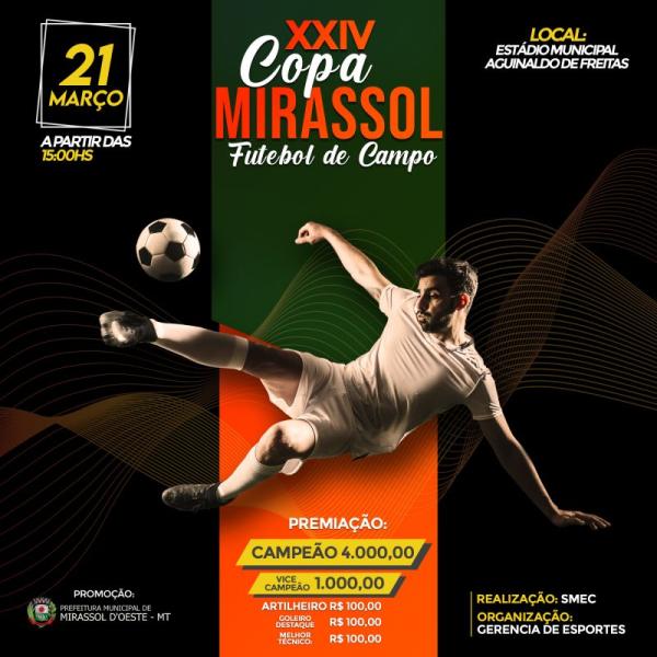 Art. 1º - A XXIV COPA MIRASSOL DE FUTEBOL DE CAMPO será promovida pelo Departamento Municipal de Esporte e Lazer na conformidade deste Regulamento, com a realização através da Prefeitura Municipal de Mirassol D`Oeste/MT e terá como principal objetivo integrar as comunidades através do esporte, além de revelar valores para o futebol.