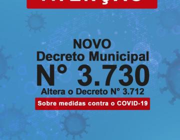Decreto Municipal 3730 altera o Decreto Nº 3.712 proibindo a colocação de mesas, cadeiras em áreas públicas e o consumo de bebidas alcoólicas nos estabelecimentos comerciais.